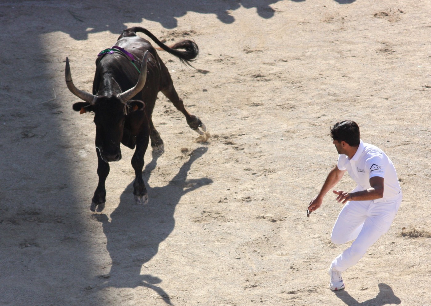 Il entre le premier sur l’immense piste d’Arles. Pas la meilleure place, le sable est brulant malgré l’arrosage, le soleil frappe toute l’arène, les raseteurs sont au meilleur de leur forme. Il terminera la course la langue pendante, ayant tout donné.